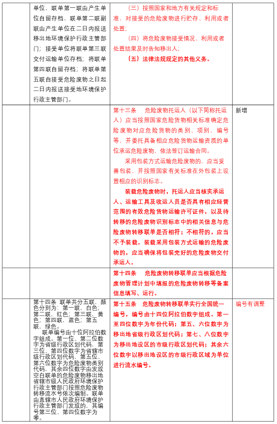 对于危险废物移出人,具有对危险废物的合规委托责任、编制管理计划、建立管理台账、如实填写运行转移联单、及时核实接受人利用处置危险废物等责任。对于危险废物承运人,具有核实危险废物转移联单、如实填写运行转移联单、记录运输轨迹、合规运输、将危险废物全部交付给接受人和及时告知移出人运输情况等责任。对于危险废物接受人,具有核实拟接受的危险废物相关信息、如实填写运行转移联单、合规利用处置、及时告知移出人危险废物接受及利用处置情况等责任。对于危险废物托运人,具有确定危险废物对应危险货物类别、编号等信息,以及合规委托、妥善包装、核实承运人相关信息等责任。答:《转移办法》对危险废物转移联单的运行管理作了进一步的细化完善。