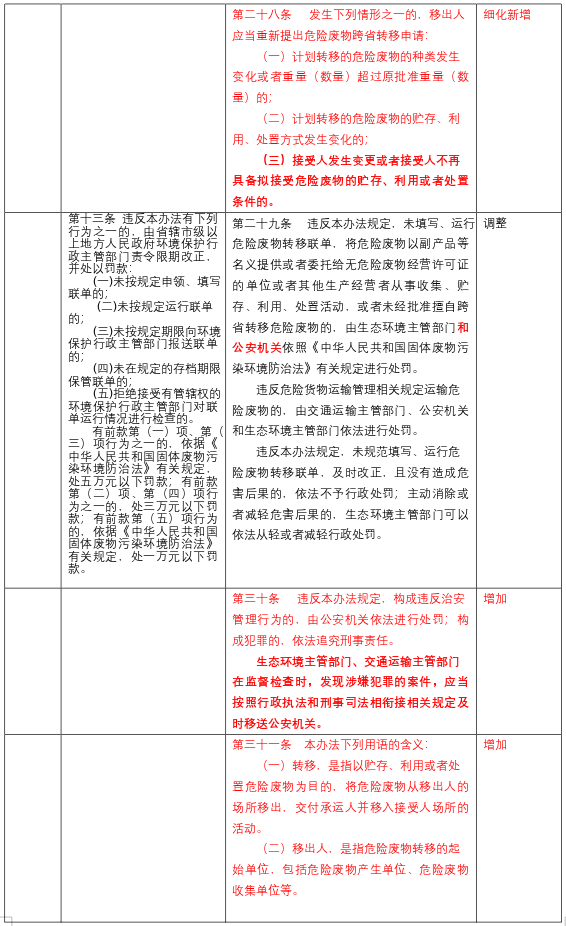 另一方面,针对危险废物转移处置,我部按照《关于提升危险废物环境监管能力、利用处置能力和环境风险防范能力的指导意见》要求,推动建立“省域内能力总体匹配、省域间协同合作、特殊类别全国统筹”的危险废物处置体系;各省(自治区、直辖市)大力提升危险废物处置能力,已基本实现省域内危险废物处置能力与产废情况总体匹配,为危险废物在省域内就近转移处置奠定了基础。对于确需跨省转移处置的,《转移办法》提出应以转移至相邻或开展区域合作省份的危险废物处置设施,以及全国统筹布局的特殊类别危险废物处置设施为主。答:为了进一步加强对危险废物转移的监管,《转移办法》规定了危险废物转移的移出人、承运人、接受人、托运人等转移相关方的责任,明确了从移出到接受各环节的转移管理要求。