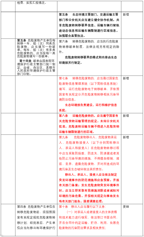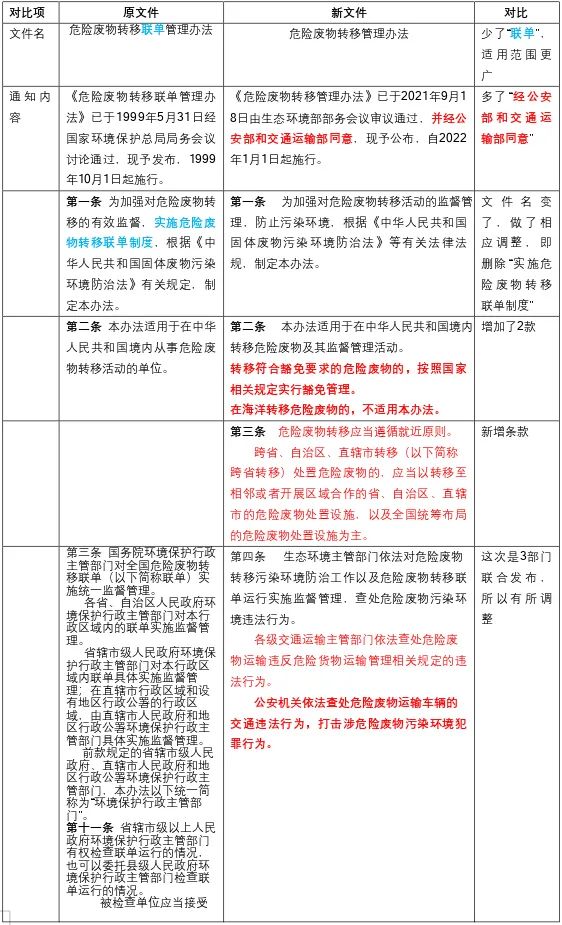 答:党中央、国务院高度重视危险废物污染防治和环境风险管控工作,习近平总书记多次就危险废物非法转移倾倒案件作出重要指示批示。新修订实施的《中华人民共和国固体废物污染环境防治法》(以下简称《固废法》)规定危险废物转移管理应当全程管控、提高效率。1999年印发实施的《危险废物转移联单管理办法》(以下简称《联单办法》)已不能适应当前危险废物转移管理工作需要。生态环境部会同公安部和交通运输部制定《管理办法》,进一步完善危险废物转移管理制度,是贯彻习近平总书记重要指示批示精神的有力举措,也是落实《固废法》,落实“放管服”改革要求,加强危险废物全过程管理,优化跨省转移审批服务的具体行动。答:相较于《联单办法》仅涉及危险废物转移联单的管理,《转移办法》对危险废物转移全过程提出了管理要求,增加了危险废物转移相关方责任、跨省转移管理、全面运行电子联单等内容,完善了相关条款:一是在《联单办法》基础上,重新制定《转移办法》,由生态环境部、公安部、交通运输部联合印发。二是明确危险废物转移相关方的一般责任,增加了移出人、承运人、接受人、托运人责任,细化了从移出到接受各环节的转移管理要求。三是明确危险废物转移遵循就近原则,尽可能减少大规模、长距离运输。四是强化危险废物转移环节信息化管理,推动实现危险废物收集、转移、处置等全过程监控和信息化追溯。 五是优化危险废物跨省转移审批服务,落实“放管服”改革要求,对申请材料、审批流程进行了简化,提高审批效率,加强服务措施。答:一方面,危险废物长距离转移不利于环境监管,环境风险高,涉危险废物环境违法犯罪案件多发生在这一环节;危险废物大规模、长距离转移还将大幅增加大气污染物排放和碳排放。因此,《转移办法》提出危险废物转移总体应遵循就近原则。