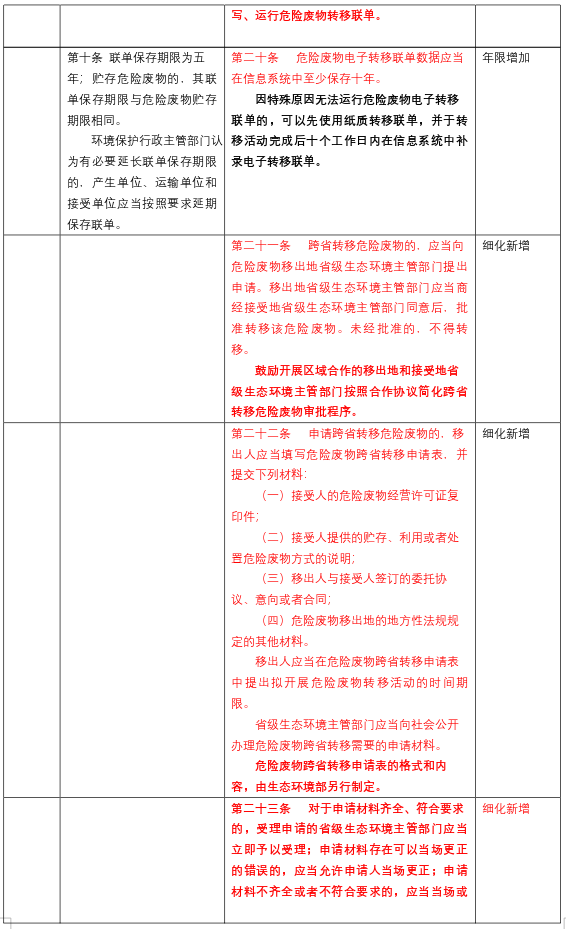 一是加强信息化监管,全面运行危险废物电子转移联单。通过国家危险废物信息管理系统填写、运行危险废物电子转移联单。因特殊原因无法运行电子联单的,可先使用纸质联单,于转移活动完成后十个工作日内在信息系统补录。二是危险废物电子转移联单数据应当在信息系统中至少保存十年。依照国家有关规定公开危险废物转移相关污染环境防治信息。三是实行危险废物转移联单全国统一编号,危险废物转移联单编号由国家危险废物信息管理系统统一发放。四是优化转移联单运行规则,允许同一份危险废物转移联单转移一个或多个类别危险废物,增加了不通过车(船或者其他运输工具)且无法按次对危险废物计量的其他转移方式的联单运行要求。答:为了解决危险废物跨省转移难的问题,《转移办法》对《固废法》规定的危险废物跨省转移审批事项和审批活动进一步进行规范和完善。