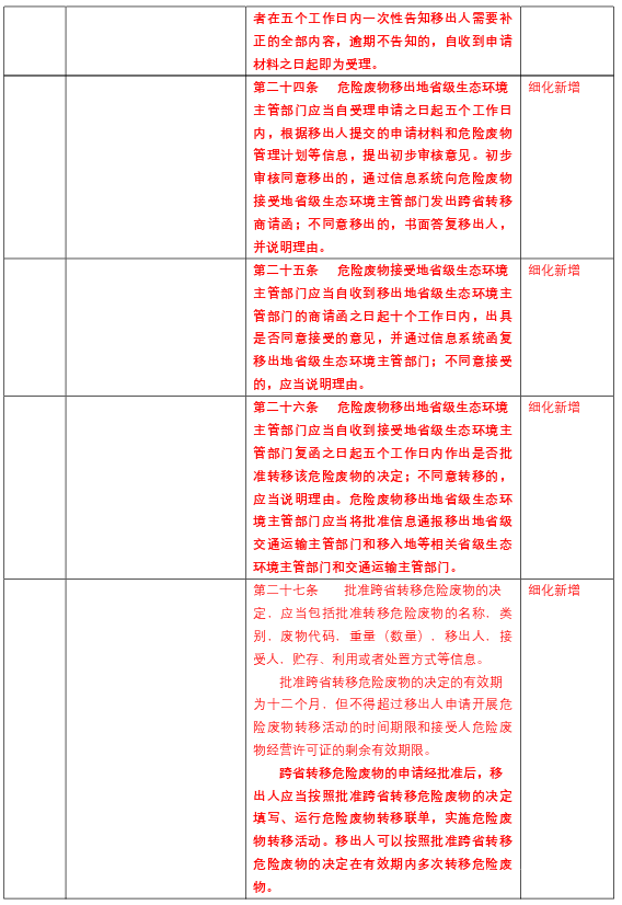 一是根据新修订的《固废法》,明确了危险废物跨省转移的申请材料、审批流程、审批时限等要求。二是根据“放管服”改革要求,对申请材料、审批流程进行了简化,按照《固废法》“危险废物转移管理应当全程管控、提高效率”的要求,以及《中华人民共和国行政许可法》的有关规定,将危险废物跨省转移审批时限控制在20个工作日,大幅提高危险废物跨省转移审批效率。三是推动通过国家危险废物信息管理系统实现危险废物跨省转移线上商请、函复等活动,简化审批手续,压缩转移审批周期。四是鼓励开展危险废物利用处置区域合作的移出地和接受地省级生态环境部门按照合作协议简化跨省转移审批流程。五是批准跨省转移危险废物的决定有效期为十二个月,可以跨年,但不超过移出人申请开展危险废物转移活动的时间期限和接受人危险废物经营许可证的剩余有效期限。答:以贯彻落实《管理办法》为抓手,加强危险废物全链条、全过程环境管理,同时强化服务意识,多措并举为危险废物污染防治和环境风险管控相关责任方提供便利服务。
